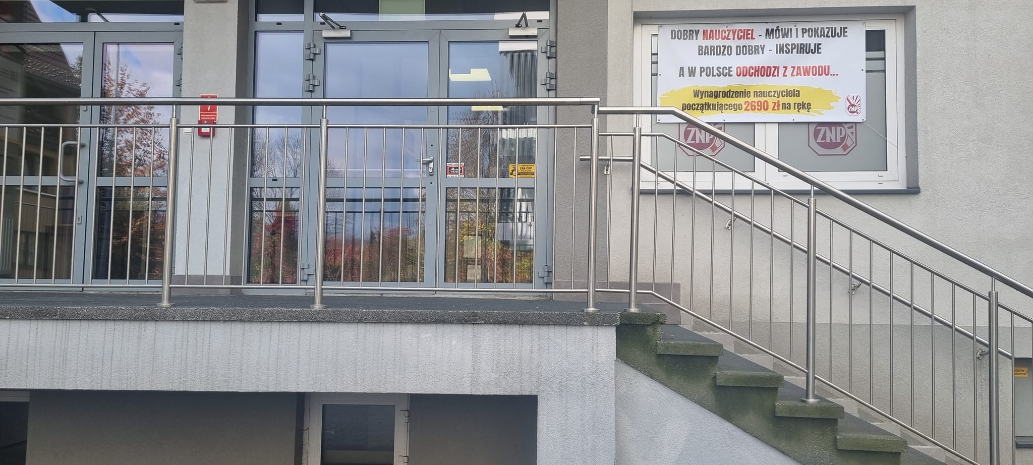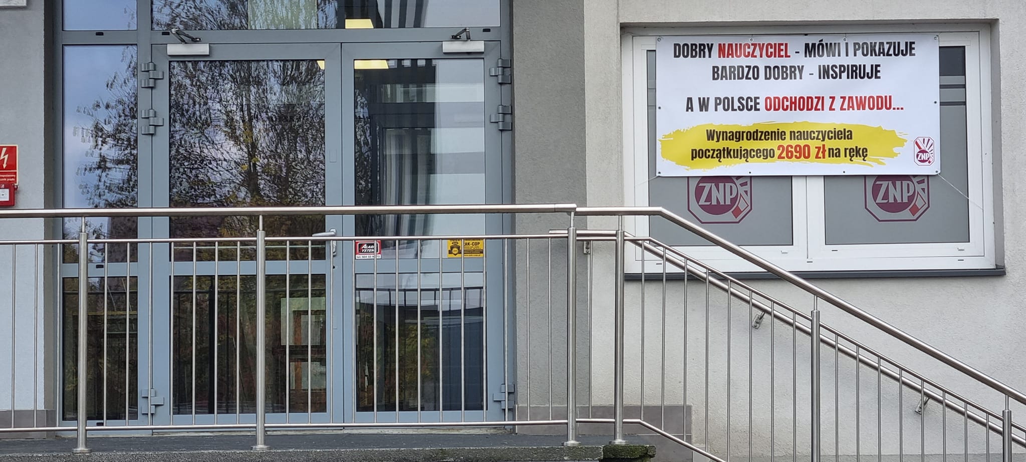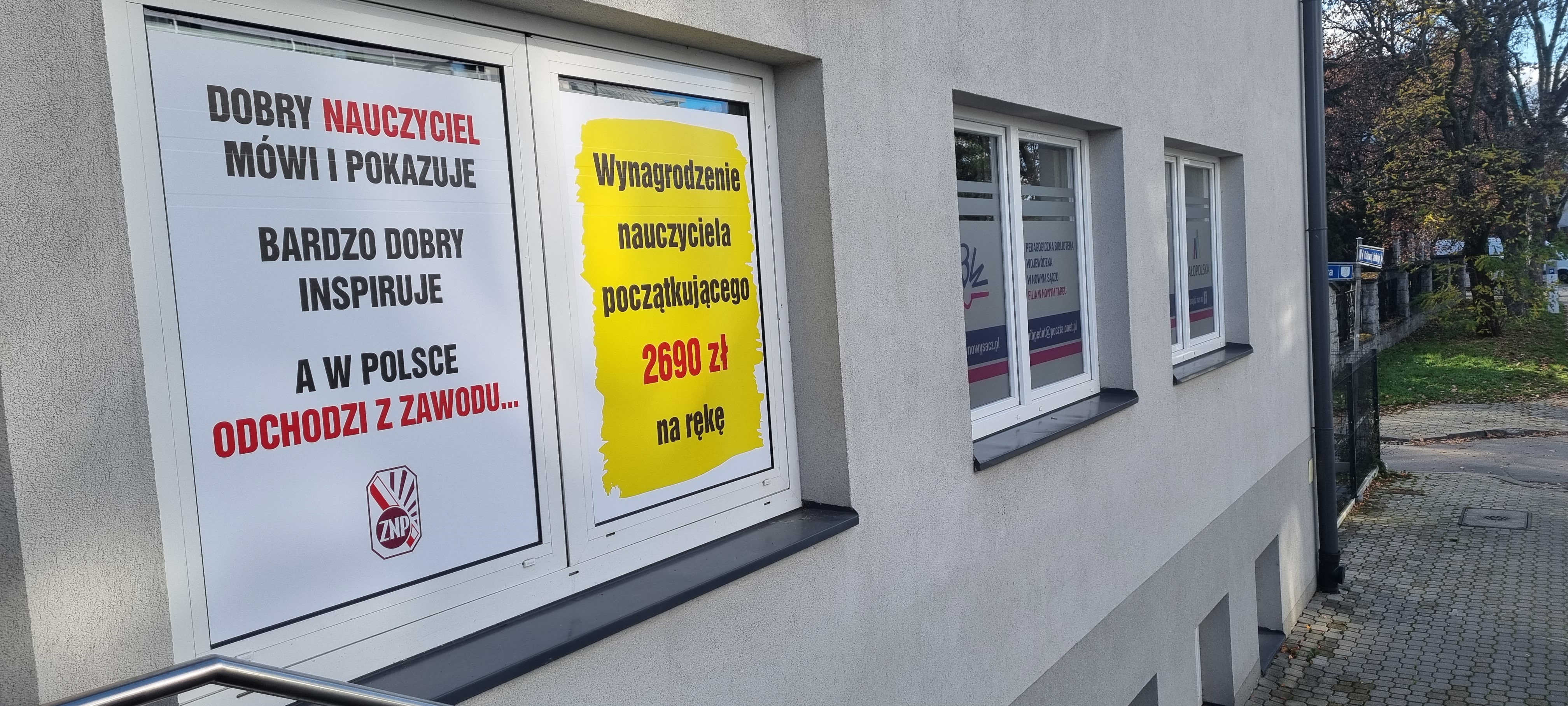 W wyniku interwencji, prawdopodobnie Delegatury Kuratorium Oświaty w Nowym Targu (która swoje biura ma na 1p.) dostaliśmy telefon od administratora budynku z prośbą, nie przyjmującą odmowy, aby ściągnąć nasz baner informacyjny. Związek Nauczycielstwa Polskiego oczywiście niezwłocznie przychylił się do prośby i zlikwidował kłujący w oczy billboard. Teraz nasze okna wyglądają nawet ładniej 😉