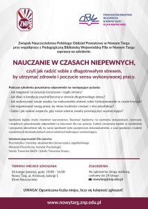 26 lutego w Domu Nauczyciela w Nowym Targu, odbyły się organizowane przez Związek Nauczycielstwa Polskiego przy współpracy z Pedagogiczną Biblioteką Wojewódzką filia Nowy Targ, warsztaty dla nauczycieli pt. „NAUCZANIE W CZASACH NIEPEWNYCH czyli jak radzić sobie z długotrwałym stresem, by utrzymać zdrowie i poczucie sensu wykonywanej pracy”.