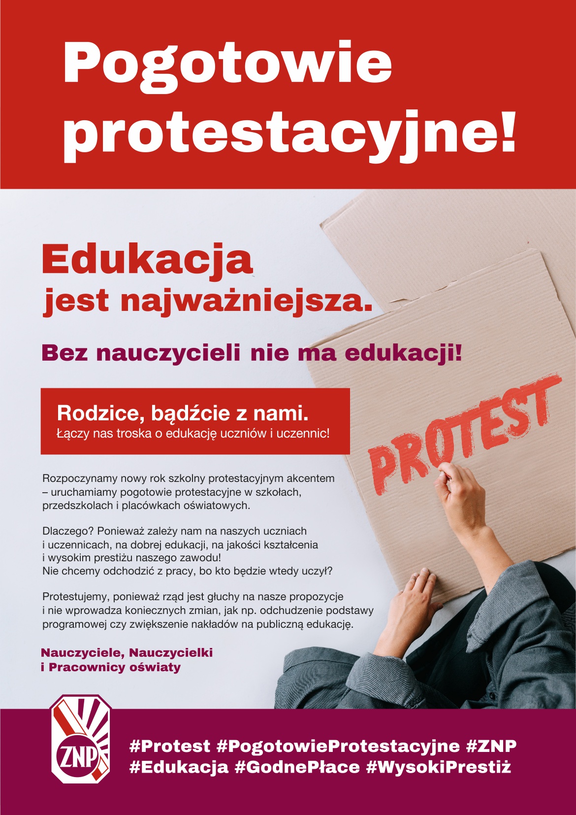Rozpoczynamy nowy rok szkolny protestacyjnym akcentem – uruchamiamy pogotowie protestacyjne w szkołach, przedszkolach i placówkach oświatowych, bo zależy nam na naszych uczniach i uczennicach, na dobrej edukacji, na jakości kształcenia i wysokim prestiżu naszego zawodu! Nie chcemy odchodzić z pracy, bo kto będzie wtedy uczył?