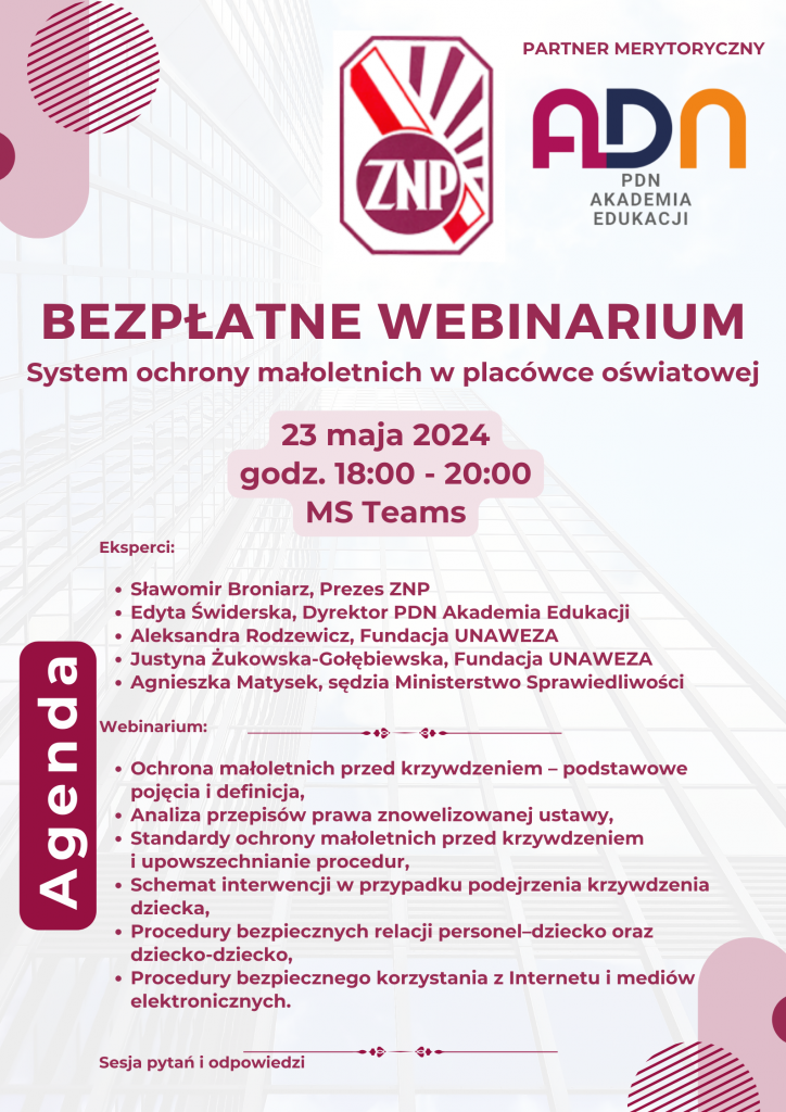 zaprasza na webinarium „System ochrony małoletnich w placówce oświatowej”, które odbędzie się 23 maja o godzinie 18.00.