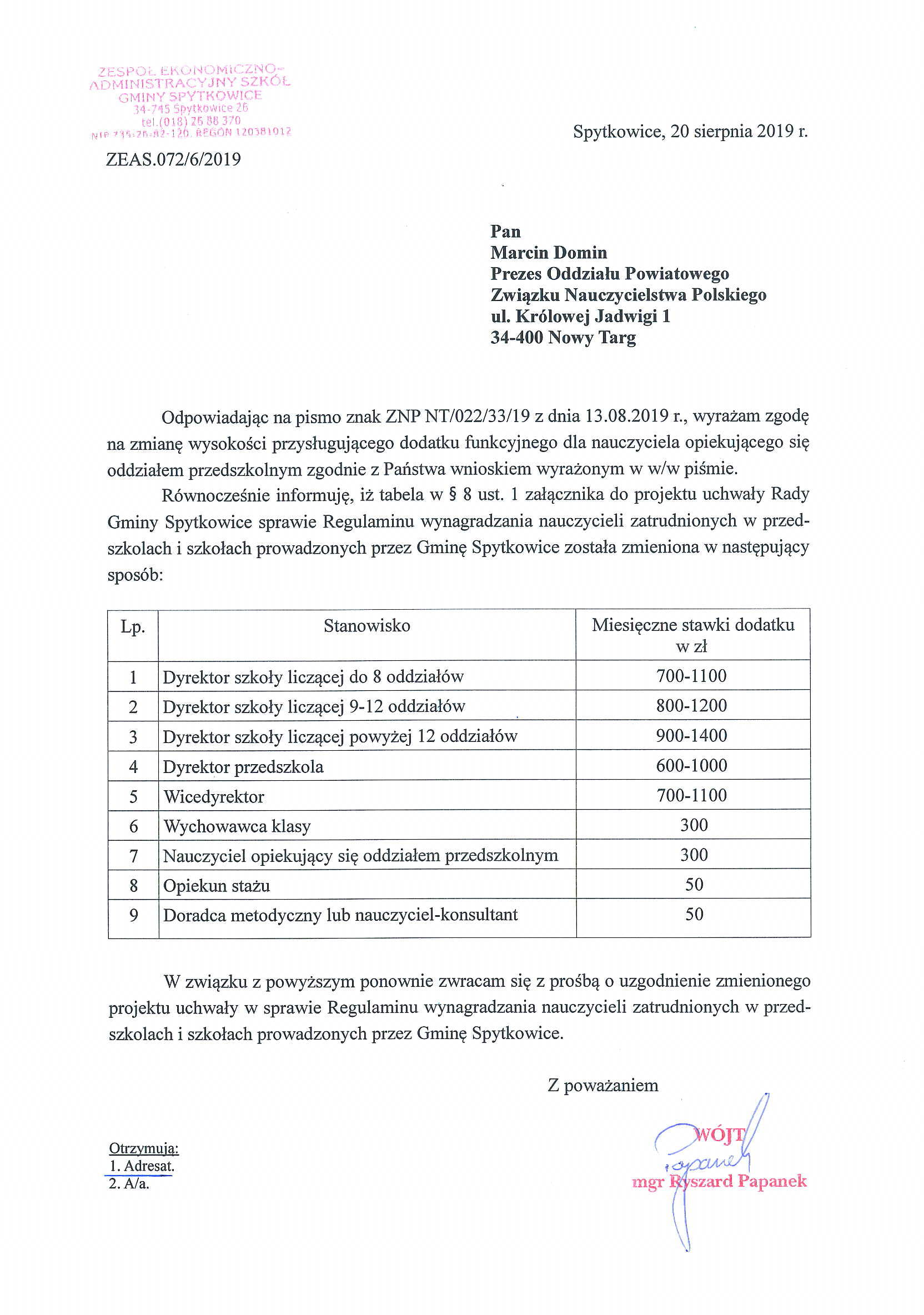 Bardzo cieszy nas fakt, że nasze argumenty co do zmiany Regulaminu wynagradzania nauczycieli w szkołach i przedszkolach Gminy Spytkowice znalazły posłuch u Pana Wójta, który zmienił swoją wcześniejszą decyzję i podwyższył nauczycielom przedszkolnym dodatek za wychowawstwo do kwoty określonej w art. 34a Karty Nauczyciela.