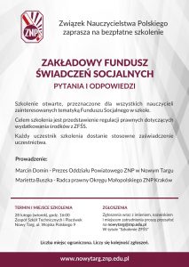 Bardzo serdecznie dziękujemy pani mecanas Marietcie Buszce za profesjonalne poprowadzenie wczorajszego szkolenia z Zakładowego Funduszu Świadczeń Socjalnych. Dziękujemy także wszystkim, którzy licznie zgromadzili się w gościnnych progach Zespołu Szkół Technicznych i Placówek w Nowym Targu. Omawianą prezentację prześlemy do zainteresowanych uczestników po kontakcie mailowym.